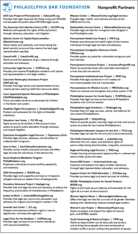 Every year, our nonprofit partners provide access to justice for tens of thousands of individuals and families in Philadelphia and across Pennsylvania. This spring, they have been working harder than ever to ensure that the individuals, families, and communities they serve have access to any information, resources, and services they may need to navigate the world during the pandemic.